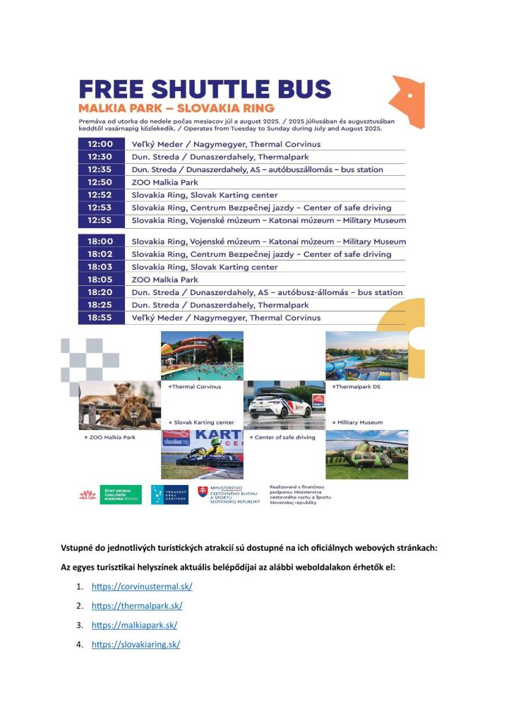 Bezplatná kyvadlová doprava na Žitnom ostrove (v júli a v auguste, od utorka do nedele), ktorá spája štyri hlavné turistické atrakcie regiónu